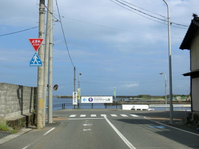 | 浜中集落を通り抜けてからもしばらくは歩道のない2車線道路が続くが、歩道が現れて車線幅が広くなった後に袖浦橋で赤川を渡る。袖浦橋を渡り終えても歩道がなくなる事はなく比較的走りやすい2車線道路を走る。左側には防風林としての松が植えられているため海は全く見えない。もっとも海岸線までの距離は1km近いうえに標高が低いため防風林がなくても海は見えない可能性が高い。 | ||