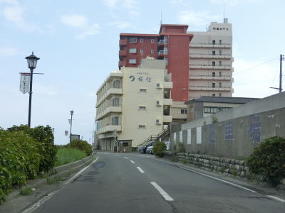 | 206.左に見えるのは湯野浜温泉砂丘像 | 207.湯野浜温泉には旅館の他にホテルもある | 208.湯野浜小学校の南で直角カーブを曲がる |