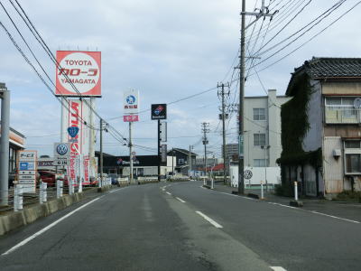 | 市道が交差している緩やかな右カーブを曲がって高館橋を渡って左カーブを曲がる。少し南に羽前大山駅があるせいか沿線に家屋が建ち並んでいる。とは言うものの改良された2車線道路のため狭苦しさや走りにくさは感じない。山形r38・r338交差点を通過し、少し走ると専念寺の門前で左カーブを曲がって先でr38が水沢方面に分岐する。 | ||