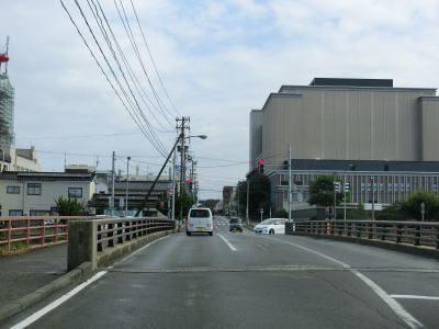 | 山形r353山居倉庫口交差点を左折して酒田市役所方面に進む。直進のr353は片側2車線道路が続いており、左折車両よりも直進車両の方がはるかに多い。山居倉庫口交差点からは対面2車線道路を北上し、右カーブの後に実生橋を渡る。 | ||