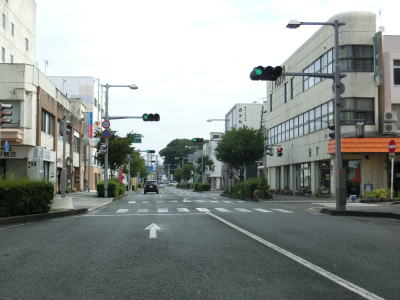 | 酒田市役所の北西で山形r42との交差点を通過する。以降は名称のある市道との交差点が連続しており、交通量は多くないが流れが悪くなりやすい。山居倉庫口交差点から約1.0kmで寺町通りという市道との交差点に至る。前方の道路の幅が狭いため右折か左折かと思ってしまうかもしれないが、国道は直進である。 | ||
