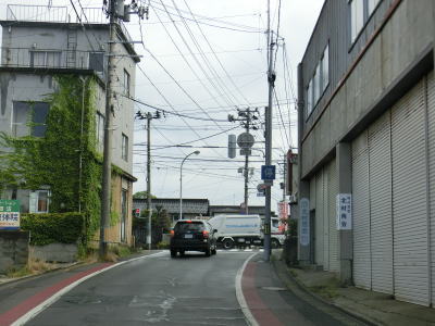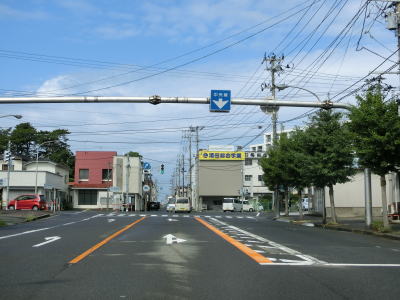 | 寺町通りとの交差点からは北向きの一方通行道路になる。道幅は1.8車線幅程度で、対面通行であれば乗用車同士なら比較的容易に離合は可能と思われる。山形市内の一方通行区間と同様に停車可の標識が設置されているが、対象は指定車のみである。 緩やかな上り勾配の先の山形r41交差点が一方通行区間の出口である。R112は左折しなければならないが、案内標識が設置されていないため注意を要する。直進の市道は1.8車線幅と道幅は変わらないが対面通行である。 |