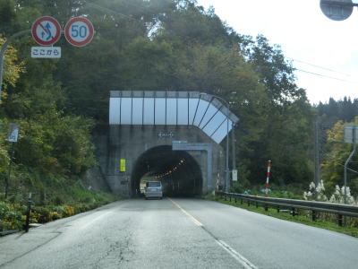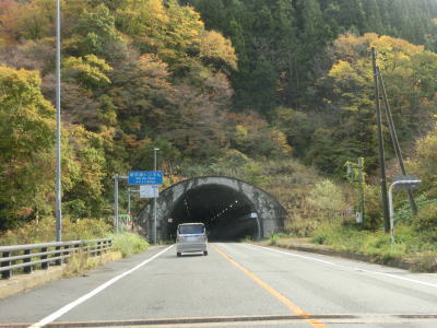 | 弁当沢トンネルを出てすぐに紅葉橋でJR米坂線の上を通って右カーブを曲がる。明沢川の右岸を走っていると栗松トンネル、明沢トンネルを相次いでくぐる。明沢トンネルの手前の明沢橋は明沢川に架けられているが、トンネルを出てから渡る岩屋橋と登戸橋は支流の桜川に架けられている。 | ||