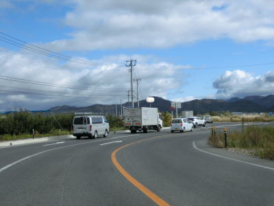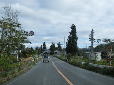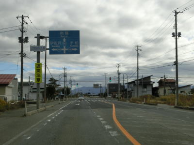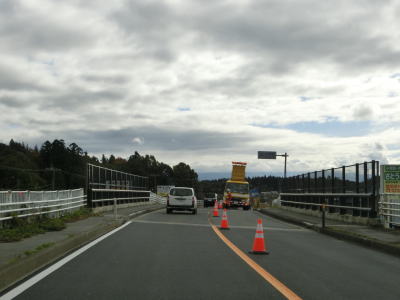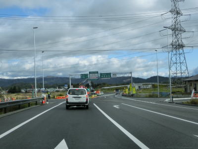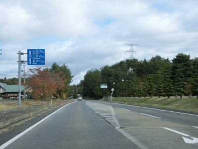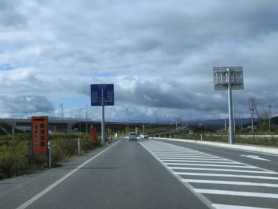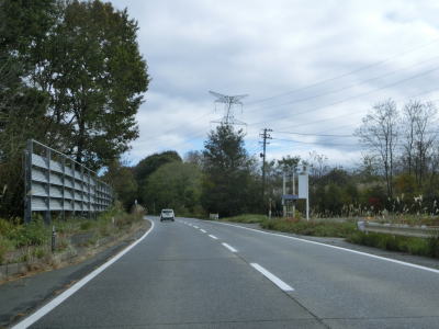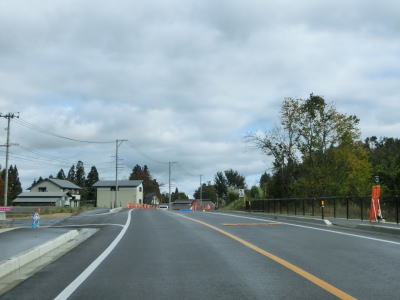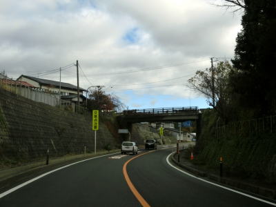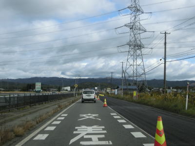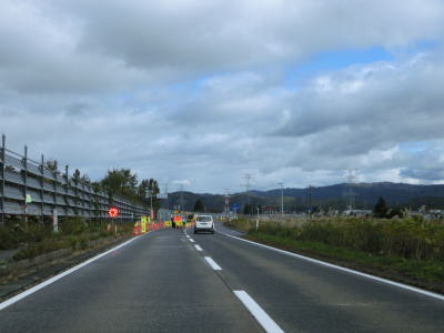 | 今泉交差点を左折してすぐに右カーブを曲がる。交差点の直後から反対側の西向き車線の舗装工事による片側交互通行規制が敷かれており、梨郷道路の西向き車線の通行止規制もあったが、さほど待つ事もなく通過できた。 約1.1km走ると今泉緑町1交差点を通過するが、右折の米沢・川西方面はR287の旧道である。今泉緑町1交差点を過ぎると上り勾配となり今泉跨線橋でJR米坂線と山形鉄道を越える。 |