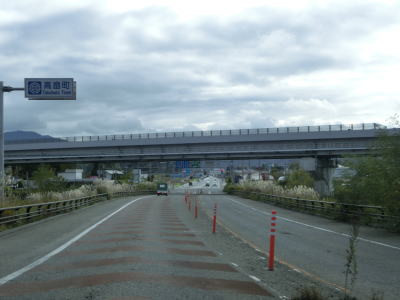 | 山形r157の上を中ノ目こ道橋で越えた直後にR13・R399に接続する鍋田ランプを通過する。赤湯こ道橋の下の鍋田交差点では北の南陽市街方面がR399で、南の福島・米沢方面がR13であり、鍋田ランプから西はその両者が重複している。 | ||