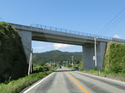 | 広い歩道の2車線道路を走っていると福島r120・r253交差点を通過し、さらに走ると歩道がなくなる。改良済み区間の距離は700m程度である。改良されたのは東日本大震災の後だが、R459の1回目の走行時(2005年)には既に基礎だけになっていた沿線の家屋もあったので元々拡幅する計画があったのだろう。 改良済み区間が終わってすぐに緩やかな勾配を上ってJR常磐線の上を通過した後に下る。常磐線も東日本大震災によって被災し、2018年9月時点においても富岡駅〜浪江駅の区間は運休となっている(2020年度に復旧予定)。 |