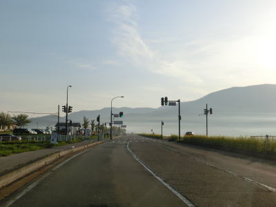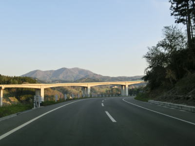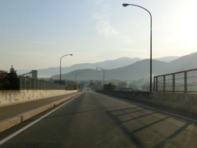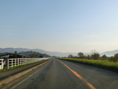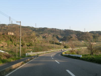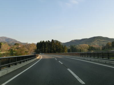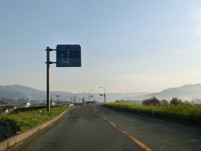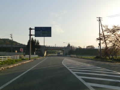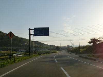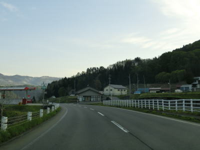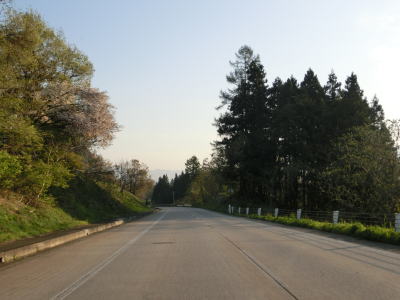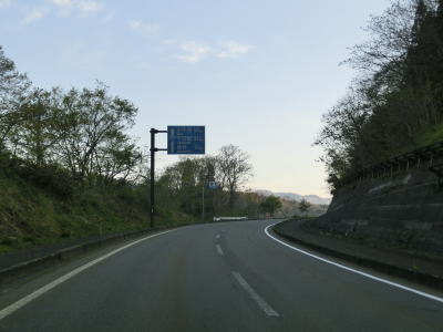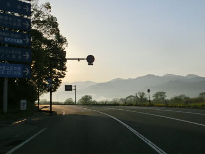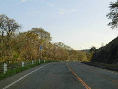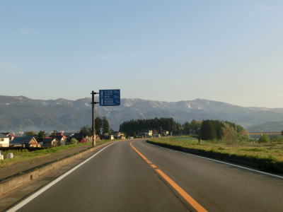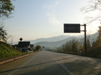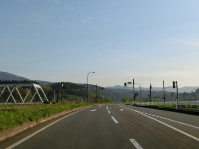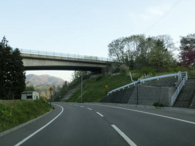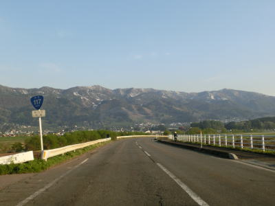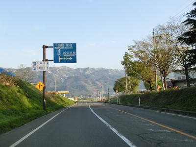 | チェーン着脱場を過ぎてすぐに大きく右にカーブして常盤大橋で千曲川の右岸に移り、左に大きくカーブする。左カーブが終わると長野r410交差点を通過する。r410交差点からは千曲川の右岸を走っており、相変わらずの2車線快走路を淡々と走る。前方には残雪のある山々が見えるが、その向こう側は新潟県である。 | ||