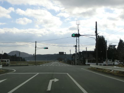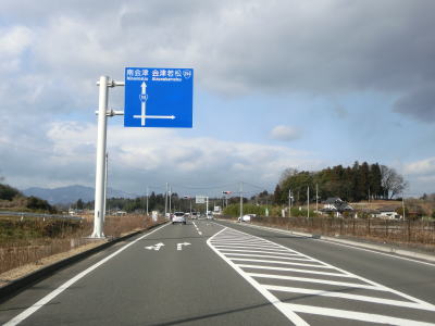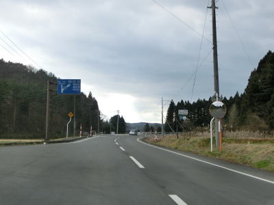 | 左カーブを曲がって山裾から離れた後にR294交差点を通過する。終点のある会津若松市が右折のR294に案内されている事からも分かる通り、番号の大きなR294の方が会津若松への最適ルートである。 | ||