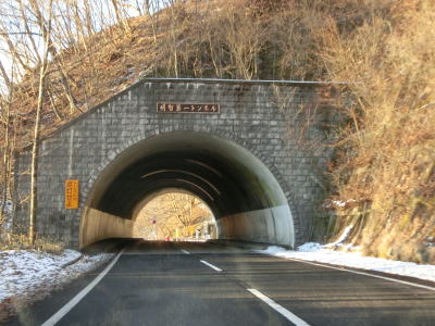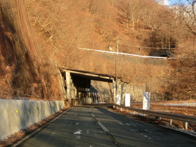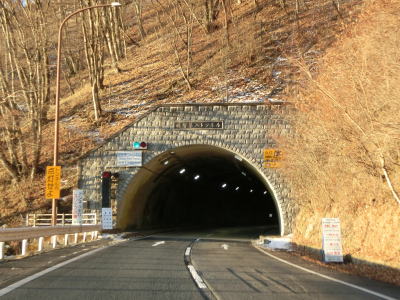 | 明智平駐車場のヘアピンカーブの直とに明智第一トンネルと明智第二トンネルをくぐる。第一トンネルの延長は42mと短いが、第二トンネルの延長は926mと結構な長さである。明智第二トンネルからは下り勾配となる。対面通行だった頃はオレンジ色の実線だったが、一方通行になってから白色の破線に変更されている。 | ||