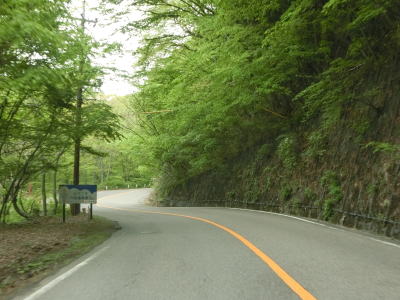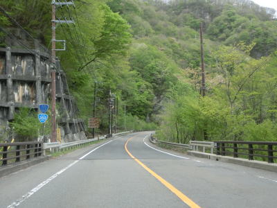| 野岩鉄道の葛老山トンネルの南坑口付近の上を通ってから右のヘアピンカーブを曲がり、再び葛老山トンネルの上を通る。鬼怒川の支流の男鹿川の手前を左にカーブすると2ヶ所目の異常気象時通行規制区間に入り、その直後に長短2つのロックシェッドをくぐる。 | ||