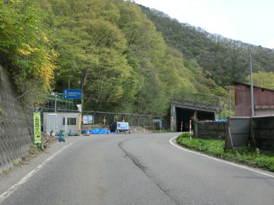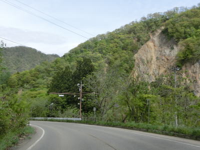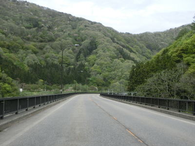| 大川ダムの傍で小沼崎トンネルをくぐり、出た直後に新水沢橋を渡って会津若松市に入り、水沢に沿った後に本流の阿賀川に沿って大きく左にカーブするが、対岸を見ると山が崩れかけているのが確認できる。 | ||