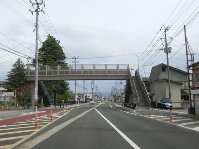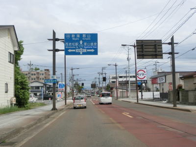 | 北柳原交差点からも緩やかな勾配が続いて扇町跨線橋でJR磐越西線の上を越えると下る。平坦な片側2車線道路を少し走ると観音前交差点に至り、右折するとR49との重複区間が終わる。北柳原交差点からの距離は約1.2kmと短い。 | ||