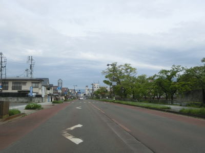 | 大橋を渡り終えた後に福島r211交差点を通過して鶴ヶ城の堀に沿って走る。堀に沿っている部分だけ自転車通行帯が設置されている。自転車通行帯が終わると車線数は変わらないが歩道が広く取られている。 | ||