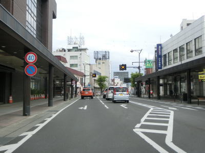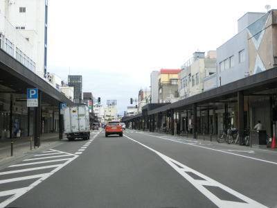 | 会津若松市役所の西の神明通り南交差点からはアーケード街を走る。アーケードの北端でR118・R252・R401・福島r325神明通り北交差点を通過する。R252の終点の交差点だが、案内標識が設置されておらず国道が交差しているようには見え難い。 | ||