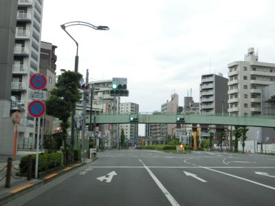 | 片側3車線道路を走っていると東京r318との宮堀交差点を通過する。r318は環七通りと呼ばれる幹線道路であり、神谷陸橋が交差点の上を越えている。宮堀交差点以北も片側3車線道路が続いており、大型貨物車両と特定中型貨物車両の指定通行帯が右側車線である点も継続している。 | ||