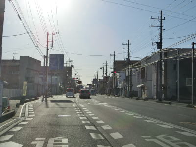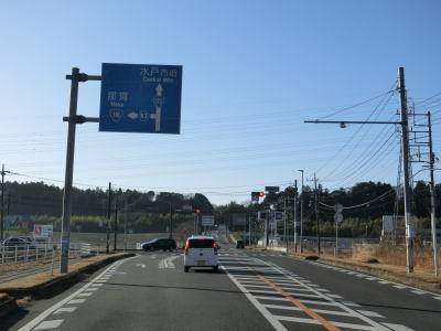 | 国田大橋西交差点を過ぎると上り勾配が始まって田野川橋を渡る。さらに上って平坦になると同時に水戸市の市街地に差し掛かって周辺の家屋が一気に増える。片側2車線の茨城r113との交差点を通過し、そのすぐ先にもウォっちずで県道扱いされている道路との交差点を通過する。後者は旧道と思われ、1.0車線幅の狭路があるため住民か沿線に用事でもなければ走行しないような道路である。 左カーブを曲がってから少し走ると車線が増えて対面4車線道路になる。住宅と商業施設が混在している中を走っているとR118・R400袴塚3交差点に至る。水戸市の中心部からは4km以上も手前だが、この交差点がR123の終点である。R400はR118の那珂・水戸市街の両方面に重複しており、上位国道から分岐するのは栃木県大田原市であり茨城県内に単独区間が存在しない。 |