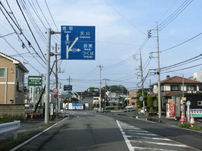 | 下り勾配が終わって平坦になった後に茨城r344交差点と茨城r505交差点を相次いで通過する。r505はつくば市でも交差していた県道であり、桜川土浦潮来自転車道線で一部は筑波鉄道の廃線跡が転用されている。r344は真鍋停車場線という路線名だが、筑波鉄道が廃線になっている事からも分かるように真鍋駅も廃止されており、駅に接続しない停車場線になってしまっている。公式には廃止されていないはずだが、ウォっちずでは県道色に塗られていない。 新川に架かる真鍋橋を渡ると右カーブを曲がりながら土浦警察署東交差点を通過する。その先の亀城公園北交差点を左折するとR354が分岐する。R125をつくば方面から南下している場合は案内標識が設置されていないため注意を要する。他の2方向から交差点に進む場合はどちらも案内標識が設置されている。 |