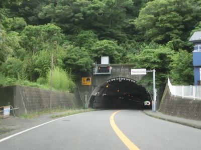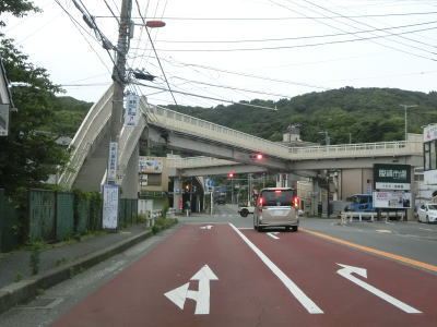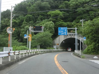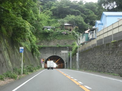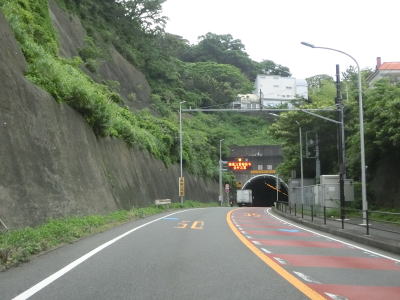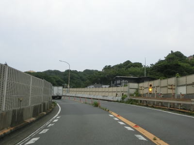 | 右カーブを曲がって海岸線から離れて緩やかな勾配を上っていると伊勢山トンネルをくぐる。トンネルを出てから小坪橋を渡り終わるまでは両側に遮音壁が設置されており、その後は掘割の中を通って飯島隧道をくぐる。短いトンネルだが、市境となっており鎌倉市に入る。 | ||