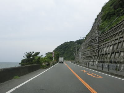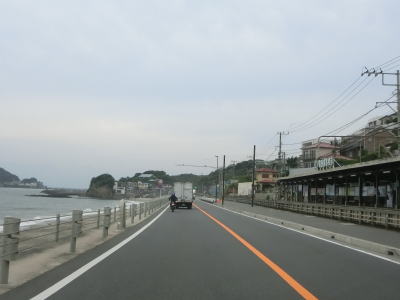 | 田越川に架かる渚橋を渡ってからは逗子海岸に沿って走る。国道のすぐ傍の砂浜が海水浴場となっている。砂浜が終わると一転して山が海に迫った地形となり、沿線の家屋も途切れる。ただし、山の上には住宅地が造成されている。 | ||
