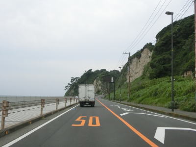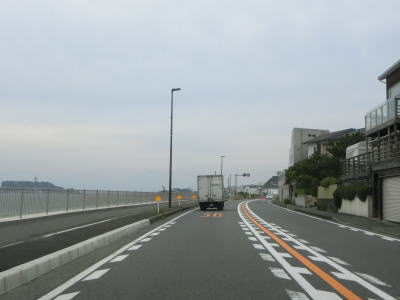 | 稲村ヶ崎を過ぎると前方に江の島が見えるようになる。相模湾と江ノ島電鉄を間を東に向かって走る。鎌倉高校前駅は歩道がプラットホームに見えるくらいの距離にある。江ノ島電鉄が離れて行った後に神奈川r304腰越橋交差点を通過する。 | ||