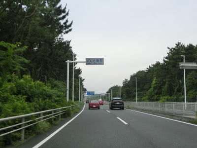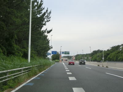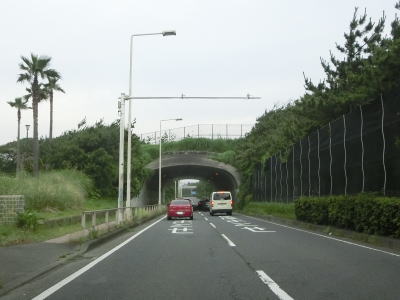 | 上下線の間が空いた後に名称不明のトンネルをくぐる。トンネルの上には遊歩道のようなものがある。上下線が接近してきた所で市境を越えて茅ケ崎市に入り、神奈川r30浜須賀交差点を通過すると交通量がさらに増える。茅ケ崎市内においても菱沼海岸や茅ヶ崎海岸といった海水浴場が続いている。 | ||