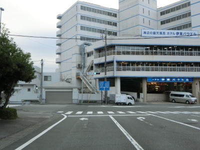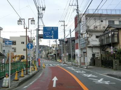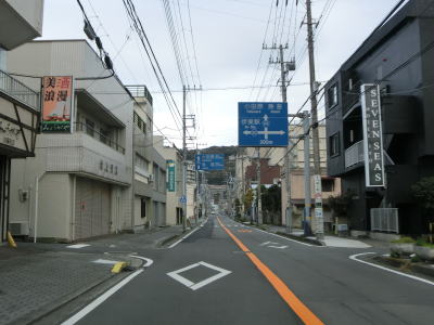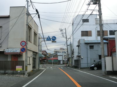 | 伊東市役所の南を通り過ぎて左、右とカーブした先で平坦になり、市道との交差点を右折しなければならない。案内標識が設置されておらず、直進も2車線道路でそちらに進む車両も多いため、事前にルートを確認していないと真っ直ぐ進んでしまう可能性が高い交差点である。 市道との交差点からも建物が密集している間を2車線道路で走り、約200mで静岡r110との交差点を左折する。この交差点にも案内標識が設置されていないが、r110が一方通行の出口なので車両では左折しかできないのでルートミスする可能性はないだろう。r110交差点からはアーケード街を走る。 |