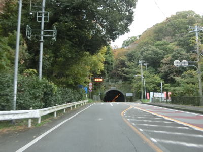 | 対面2車線道路になってすぐに曽我浦隧道と錦ヶ浦隧道を相次いで通過する。錦ヶ浦隧道を出ると左の急カーブを曲がり、旧道らしき市道との交差点を通過する。この市道には観魚洞隧道という1910年に開通したトンネルが現存している。 旧道との交差点を過ぎてさらに下った先でR135の南向き車線とのマリンスパ熱海入口交差点を通過する。この交差点から北は上下線が異なるルートとなっており、そのどちらも国道に指定されている。 |
