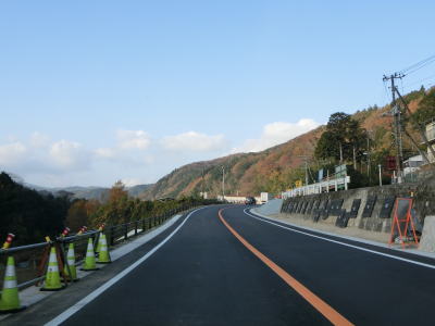 | うつぎの1号橋を渡り終えた直後に上りとなる反対側車線に400m弱の登坂車線が設置されている。その登坂車線が終わるとセンターラインがなくなり工事現場の脇を左にカーブする。走行した日は建設中だったが、その直後の2018年12月15日に供用が開始されている。現道区間は1.5車線幅と狭く沿線に家屋もほとんどない事から供用済みの土肥峠バイパス区間と同様に国道の指定を外れる可能性が高い。 | ||