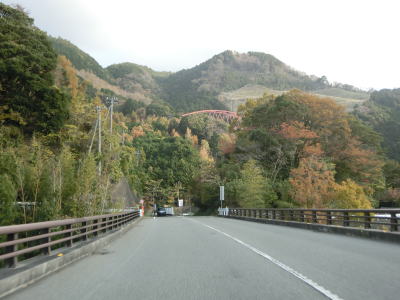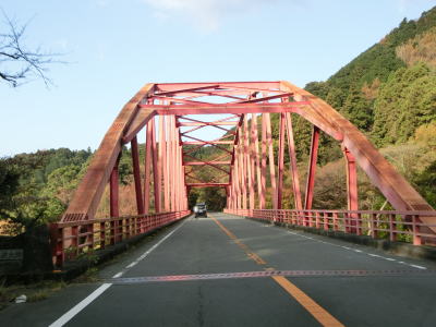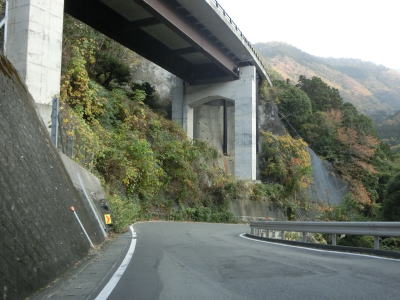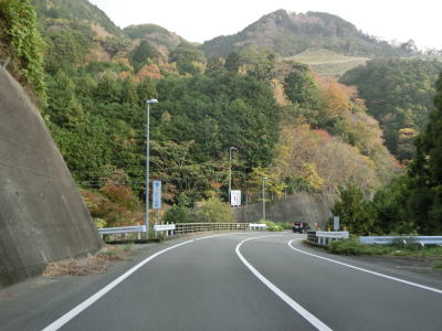 | 旧土肥町側は急勾配で急カーブが多いが、センターライン付きの2車線道路なのでそれほど走りにくさは感じない。平石集落を通過するが、斜面に建っている家屋が多く道路沿いには少ない。葭ヶ窪橋や土肥大橋、椎ノ木沢橋といった長短の橋を渡りながら勾配を下って行く。3つの橋の中では椎ノ木沢橋が最も長く眺望が良い。 | ||