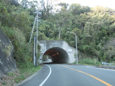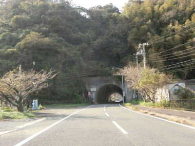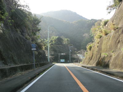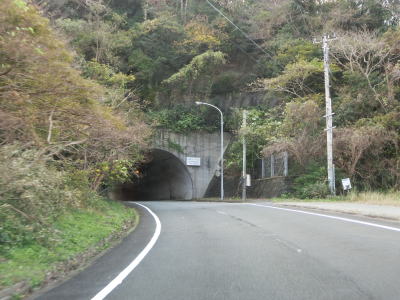 | 東條隧道を出ると妻良集落を通過するが、その他の危険を示す「!」標識が立っている。その理由は「砂」である。砂浜に近いため風で砂が道路まで飛んでくるのだろう。妻良集落の南で急カーブが連続するようになると同時にやや急な勾配を上る。左カーブを曲がっていると妻良トンネルをくぐって下り勾配に転ずる。 | ||