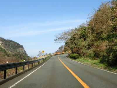 | 119.室岩洞もイラスト入りの案内標識 | 120.異常気象時通行規制区間に入る | 121.海岸線沿いを走る |