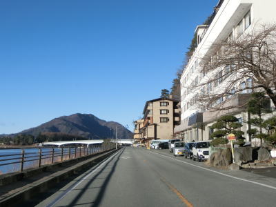 | 河口湖の湖畔を走っていると小田トンネルをくぐる。トンネルの上には小曲展望広場があり河口湖を一望できるらしい。小田トンネルからは沿線にホテルや旅館が建ち並ぶ場所を通る。船津三差路交差点から北の区間は湖畔道路とあって土産物店や飲食店も多く観光地然としている。湖に沿って大きく左にカーブして産屋ヶ崎の根元を産屋ヶ崎トンネルで通過する。 | ||
