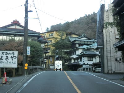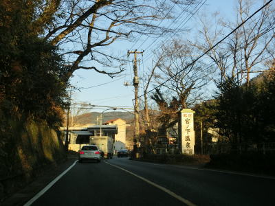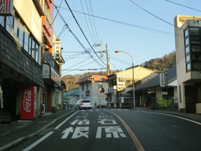 | 大平台ヘアピンカーブからはやや急な勾配となり、大平台温泉に差し掛かる。箱根登山鉄道の大平台駅の真ん前でヘアピンカーブに近い急カーブを曲がる。塔之沢温泉と同様に旅館が多く観光客が歩いている事もある。しだれ桜通りという町道との交差点からは沿線の建物が途切れる。 右カーブを曲がりながら大沢橋を渡り、次いで第一宮の下桟道を渡る。箱根登山鉄道と近接しているものの高低差があるため車両が通らない限り並走している事に気付かないかもしれない。第二宮の下桟道を渡り終えると宮ノ下温泉に差し掛かる。 |
