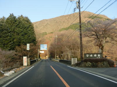 | 玉ノ緒橋を渡って右岸に移り、塔之沢発電所付近から沿線の建物が途切れる。旭橋から西は塔之沢温泉と呼ばれており、旅館やホテル等温泉関連の建物が多い。建物が途切れてからもセンターライン付きの2車線道路が続いているが、早川に沿っておりカーブが多い。右カーブの先で塔之澤橋の東詰を通って箱根登山鉄道の出山の鉄橋をくぐる。鉄橋に4.2mの制限高が設けられているが、塔之澤橋のワイヤーも結構低い位置にある(特に西向き車線)。 | ||