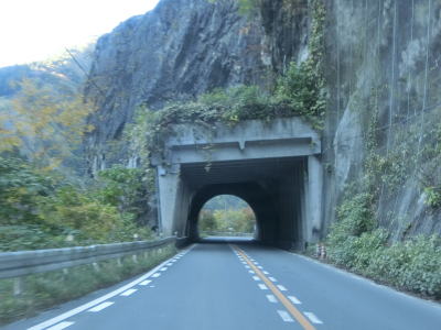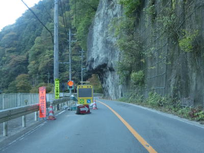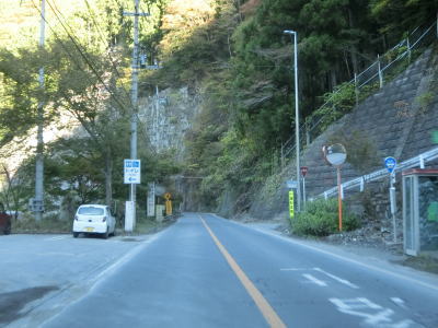 | 強石集落を過ぎるとしばらく集落が途切れて山岳部の荒々しい景色の中を走る。オーバーハングのある法面付近では災害復旧のための片側交互通行規制が敷かれていた。左の急カーブの先で光岩隧道をくぐり、さらに少し走ると大達原隧道をくぐる。どちらもトンネルも秩父市街地寄りにロックシェッドが接続している。大洞発電所の対岸で右の急カーブを曲がり荒川沿いを走っていると大達原集落を通る。集落内にはふれあい交流トイレという名の公衆トイレが設置されている。 | ||