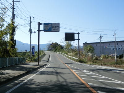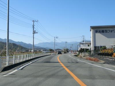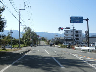 | 桃林橋南詰交差点から約400mで市町境を通過して市川三郷町に入る。境標識が設置されていないため認識しにくいが、桃林橋南詰交差点から東に200mの位置でも市町境を通過しており中央市に入っている。 2回目の市川三郷町に入ってすぐに新押出川橋を渡り、笛吹川の堤防の内側を少し走った後に川から離れる。交通量は多いものの信号機付きの交差点がさほど多くないため比較的スムースに流れている。 |