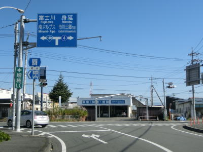 | 増穂橋を渡ると富士川町に入る。橋からの勾配を下り切り、E52中部横断道の大椚橋の直後でR52・山梨R52坪川大橋南交差点に至る。R52は現道と甲西バイパスとが並走していたが、2016年4月1日に甲西バイパスに一本化されて現道は山梨r42に降格となっている。その際にR140の終点も追分交差点から坪川大橋南交差点に移動されているはずである。しかし案内標識には未だに直進の増穂方面にR140のおにぎりが表記されていた。 | ||