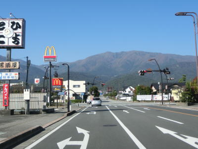 | 三郡橋北交差点からは山梨r26が重複した状態で商業施設が建ち並ぶ間を走る。市の中心部ではないが意外に多くの商業施設がある。右カーブを曲がりながら緩やかな勾配を上ると八糸川橋と新大橋、五明川橋を渡る。前方に見えているのはR52の坪川大橋だが、その手前にE52中部横断道の坪川橋もある。 | ||