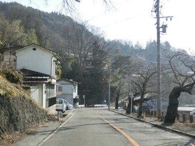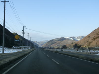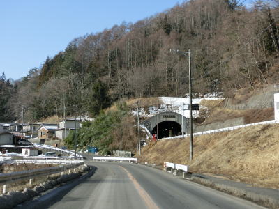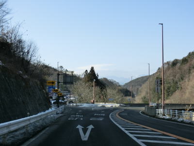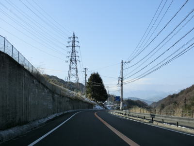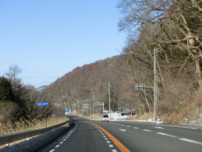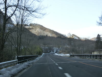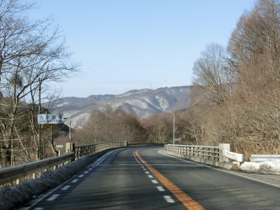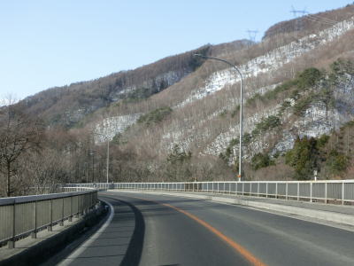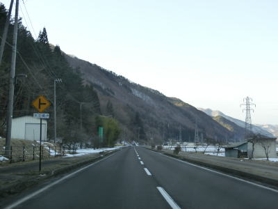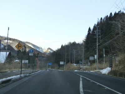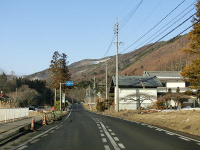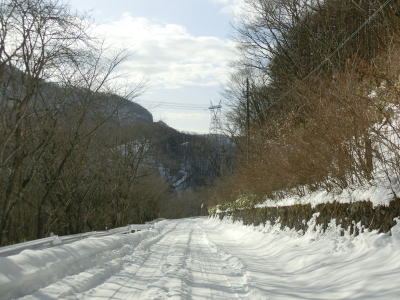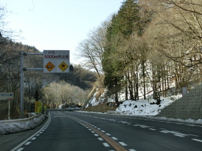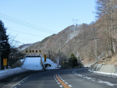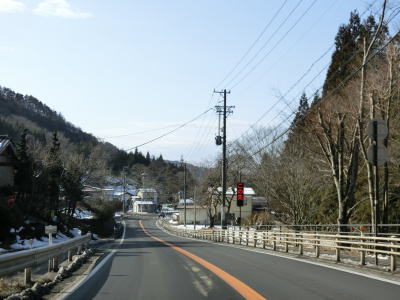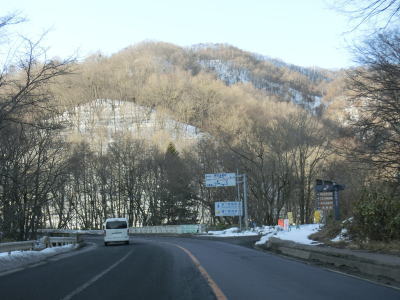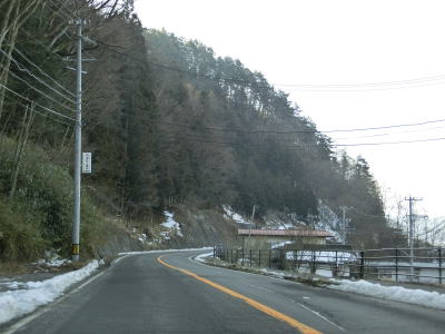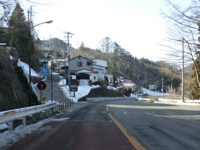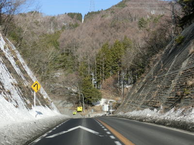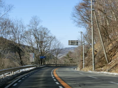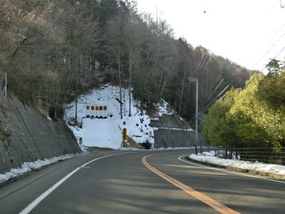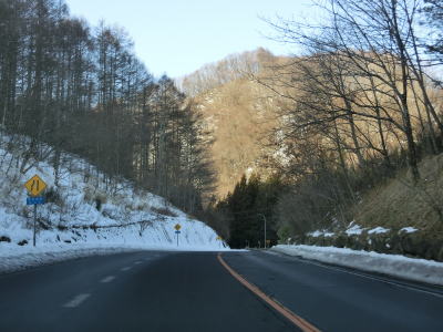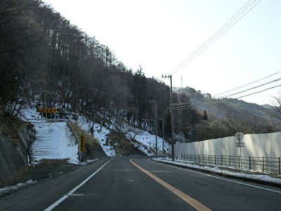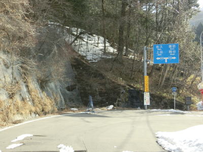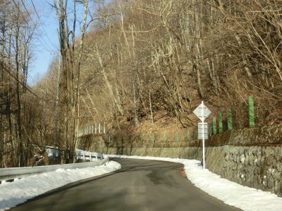 | 現道に入った直後にT字路に突き当たるが、右方向にヘアピンカーブ状に進む。左折方向はバイパスに並走した町道で男女倉集落に通じている。正面には中山道が接続しているが、車両での通行はできず徒歩のみである。 ヘアピンカーブからは緩やかなカーブの1.5車線幅道路を走る。カーブには番号が振られており、ヘアピンカーブが第2カーブである。交差点に第1カーブがあるのはバイパスが供用される以前はただのカーブだった名残であろう。第8カーブの直後にヘアピンカーブの第9カーブを曲がる。除雪はされているが日当たりの悪い場所には路面上に雪が残っていた。 |