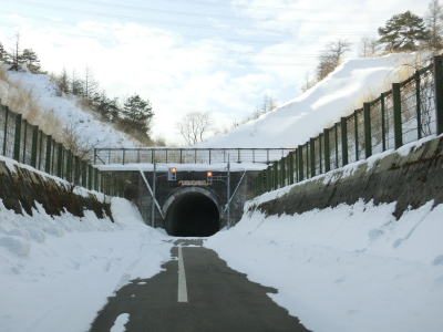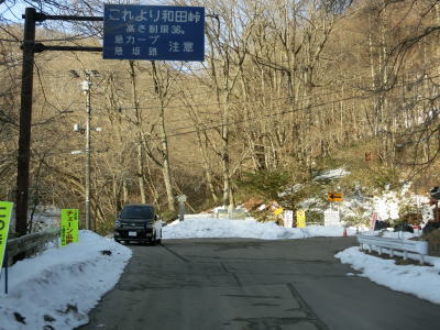 | 採石場を過ぎると除雪されているかもしれないと期待していたが除雪されていなかった。ある程度の車が通ったため轍が形成されているが、ハンドルを取られるせいで余計に走りにくくなっている。離合には路肩に寄らなければならないが、除雪されていない路肩と轍の間を通らなければならないため対向車が来ない事を祈りながらの走行となる。長和町側と同様にカーブが多く見通しが悪いため気の抜けない走行を強いられる。 トンネルを出てから約1.7km先の左ヘアピンカーブでは中山道が交差しているが、和田峠寄りはチェーンが張られている。ストリートビューを見ると冬季以外もチェーンが張られているのが確認できるが、徒歩での通行まで止めるものなのかは不明である。 |