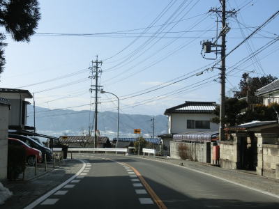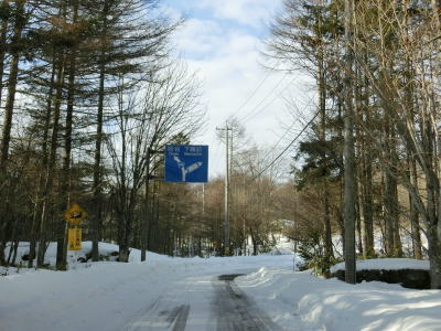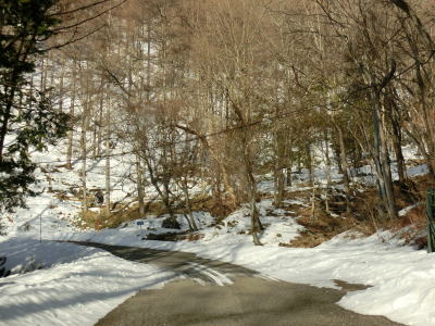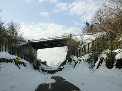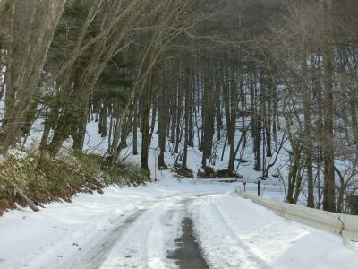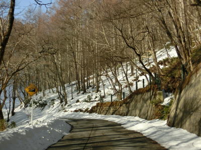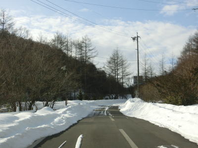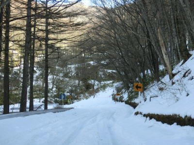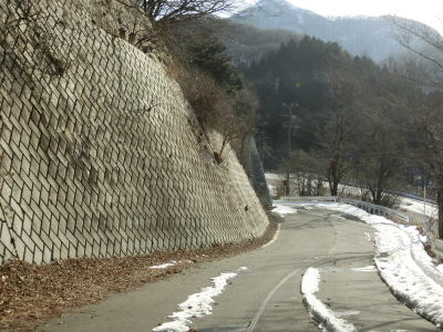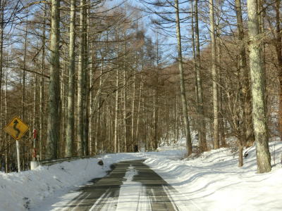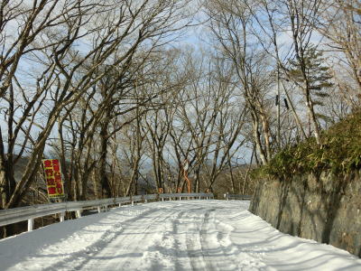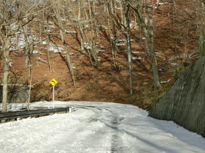 | 中山道が交差しているヘアピンカーブからは積雪量が少なくなり日当たりの良い場所の轍部分の雪は融けている割合が多くなる。資材置場(?)のある左ヘアピンカーブを過ぎて下諏訪町側で2ヶ所目の中山道との交差点付近からまた積雪量が多くなる。 | ||