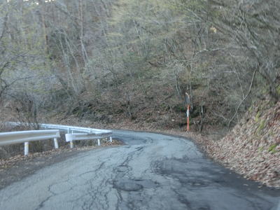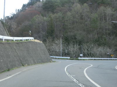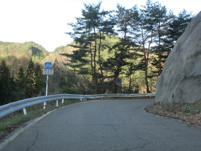 | 会吉トンネルで市村境を越えて筑北村に入り、トンネルを出た直後を右にカーブする。左には大洞林道が接続しており、長野r277まで繋がっているようだが道路状況は不明である。筑北村に入ってからも1.8車線幅の狭路が続いており、勾配が緩やかな一方で急カーブが多いという状況も松本市側と同じである。異なる点は歩道状態の悪さだろうか。落石等はないもののアスファルトそのものがひび割れや継ぎ接ぎ補修で凹凸が多い。 | ||
