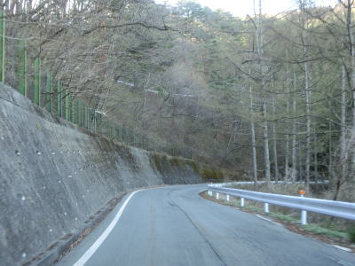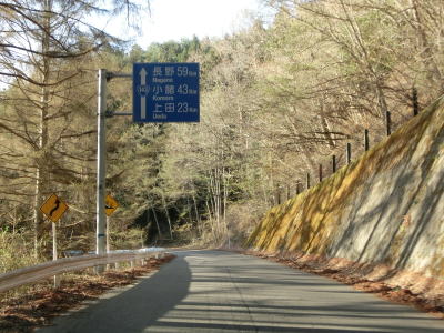 | 緩やかな右カーブの先で信州昆虫資料館や長野r172に至る村道(林道?)との交差点を通過するが、マイクロバスを除く大型・大型特殊・特定中型車両は10月20日から翌年4月15日までは走行する事はできない。もっとも交差点の直後から完全1.0車線幅なので乗用車でも好き好んで走ろうとは思わないような状態である。村道(?)との交差点を過ぎて少し走ると左のヘアピンカーブを曲がる。その後もヘアピンカーブを含む急カーブをいくつも通過しながら2.0車線幅の道路を走る。 | ||