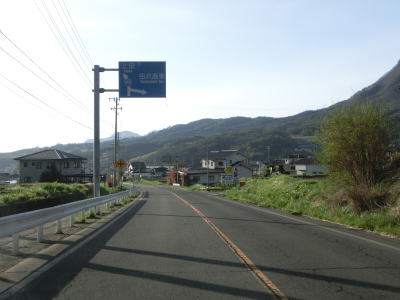 | 断続的にヘアピンカーブが連続している状態を走っていると谷筋を通っている村道との交差点を通過する。村道沿線には奈良尾集落がある。右に大きくカーブした後に左にカーブし弘法集落を通り抜ける。沿線の家屋は多くないが、旧道と思われる村道沿いには多くの家屋がある。 | ||
