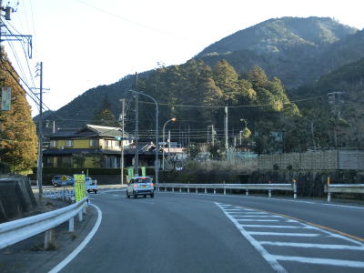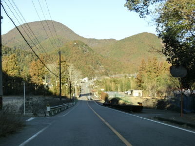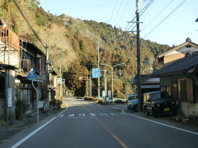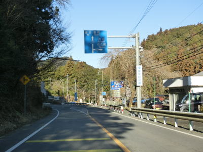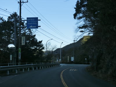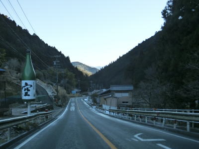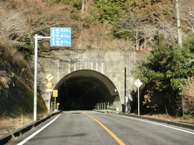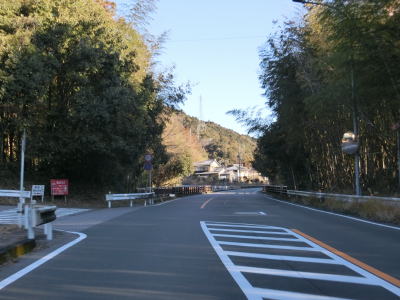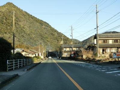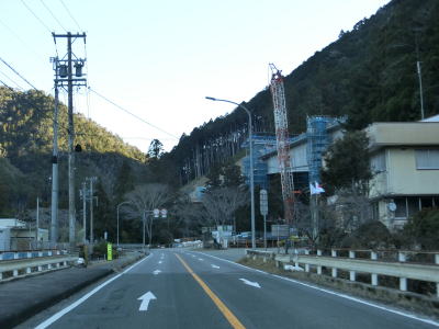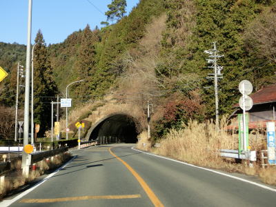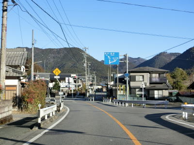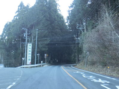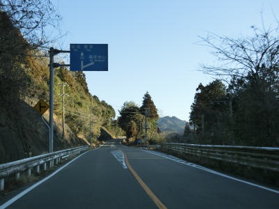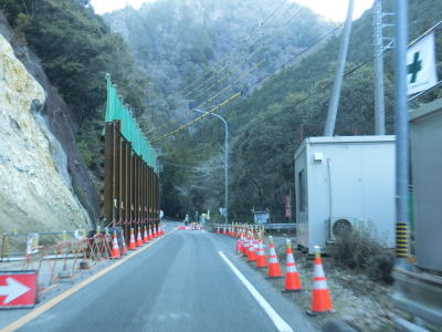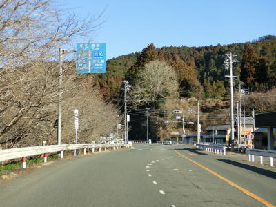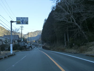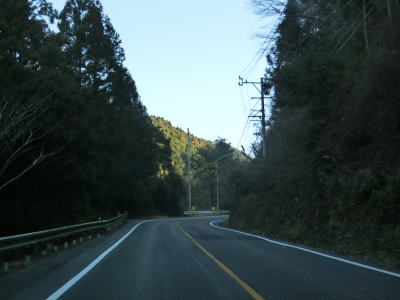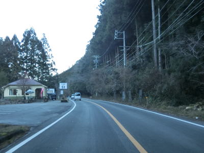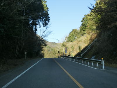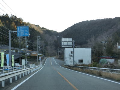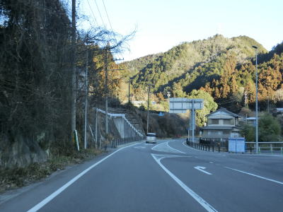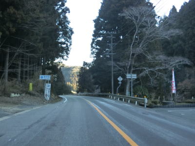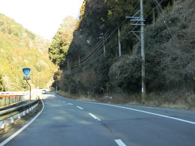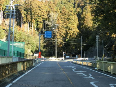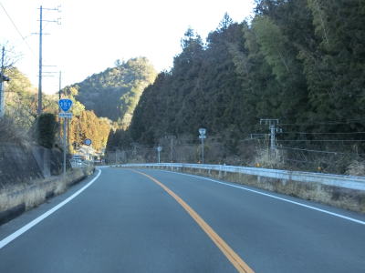 | 法面の工事のため片側交互通行規制が敷かれた区間を過ぎると集落が途切れて狭い谷筋を走る。勾配は緩やかながらカーブが多い。とは言うものの曲線半径の小さなカーブは少なく概ね走りやすい道路状況と言える。 | ||