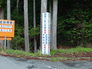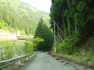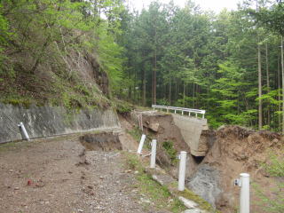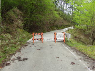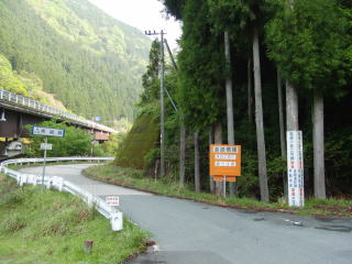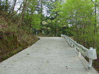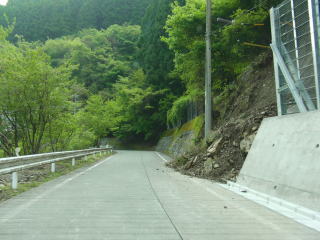 | 青崩林道に入ると舗装がアスファルトからコンクリートになる。道幅は1.5車線と狭く路肩には落ち葉等が堆積しているが、路面はさほど荒れていないし勾配も緩やかで思っているよりは走りやすい。しばらくR474の東を並走していると草木トンネルのすぐ近くでR474の下をくぐる。ここまで1ヶ所落石防止柵が途切れた所に崩落が見られたがそれ以外には異常は見られなかった。 | ||