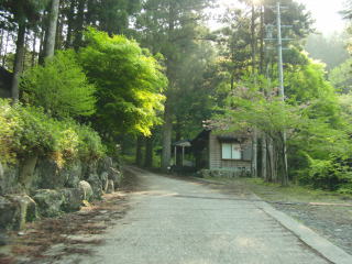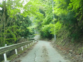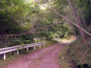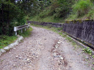| ここからは2008年9月14日に訪れた際の写真を使用している。決して崩落箇所の無理やり乗り越えた訳ではないので誤解なきよう。また2012年5月10日の時点で4年近く前のため、その後状況が変化している可能性がある事もご承知おき願いたい。 という訳で崩落がなかったものとしてレポートを続ける。離合のできない完全1.0車線幅であるだけでなく、路面は流水溝が深く刻まれており崩落していなかったとしても普通車で走行するのは難しい。最初に訪れた2005年時点では車両進入限界地点までたどり着けたのだが、2008年は塩の道の石碑近くに車を停めて徒歩で進入している。途中コンクリート舗装されている区間もあるが山側を中心に落石が多く決して走りやすくなったとは言えない。この舗装がなくなってからの方がむしろ路面は安定している。この2008年時点の状態が補修されているのか放置されているのかは不明である。 |