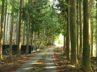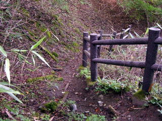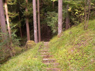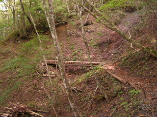 | 崩落がなけれれば車両進入限界地点となる広場から青崩峠まではものの5分ほどで峠に着くという事だったので向かう事にした。なお、この写真も2008年9月のものであり2012年5月時点ではない点に留意していただきたい。 徒歩でしか行けないとは言え登山道ではなく遊歩道と名付けらており特別な装備は必要ない。さすがに舗装されているという事はないが階段状になっている道路を下ると左側から遊歩道が合流してくる。おそらく塩の道の石碑脇からの道が合流したのだろう。遊歩道だけあって道ははっきりしており木製の橋も架けられており道を見失う心配も不要だろう。 |