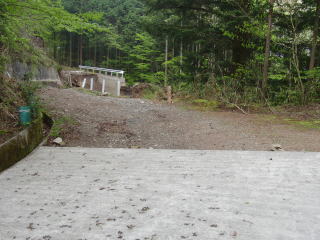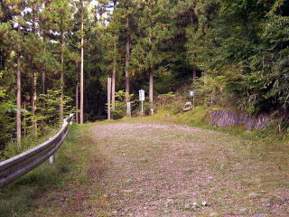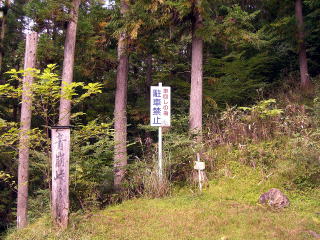 | 塩の道の石碑から800m弱で車両進入限界地点に到達する。普通車であれば何とか転回できるくらいの広さだが、駐車車両がいれば難易度が一気に高くなる。よって駐車禁止という看板が立てられている。この看板は2005年訪問時はなかった。駐車禁止の看板を正面にして右側には兵越峠に、左側には青崩峠に至る遊歩道がある。 | ||