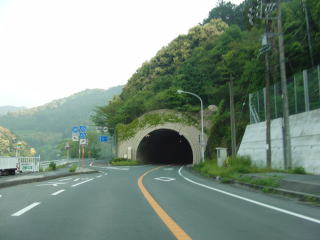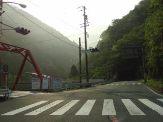 | 秋葉トンネルを出ると前方に秋葉ダムが見える。ダムの南で左にカーブして天竜川の支流の白倉川沿いになったかと思った矢先に右に大きくカーブして白倉川を渡ってから再び天竜川沿いに戻る。この白倉川合流地点付近は旧龍山町の中心部である。 左直角カーブの直後で西川トンネルに入るが、トンネルの中ほどに秋葉ダムに繋がる道路が交差している。内部に交差点がある特異なトンネルである。西川トンネルの次は大瀬トンネルをくぐり、以降しばらくはトンネルのない川沿いの快走路を走る。天竜川の右岸左岸を問わず山肌にへばりつくように場所に建つ家屋が見える。 |